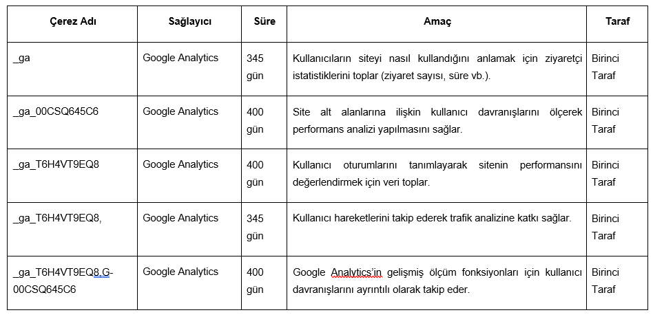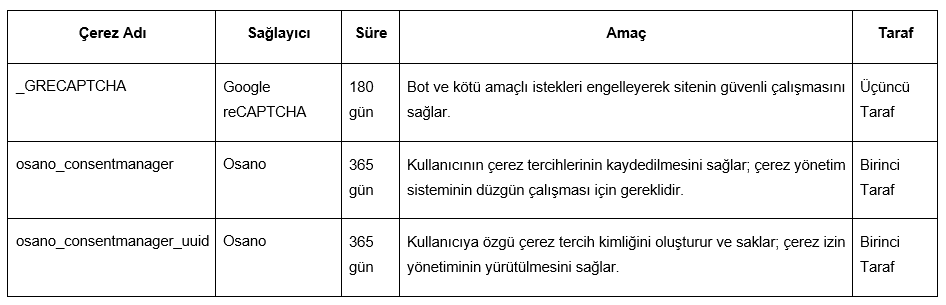 İnternet sitesinde kullanılan çerezler ve bunlara ilişkin açıklamalar aşağıda yer almaktadır.