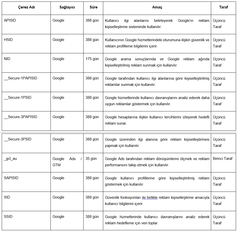 D. Hedef/Reklam Çerezleri: Reklam çerezleri, bir uygulama/internet sitesine veya kullanım ziyareti sırasında üçüncü bir şahıs tarafından yüklenen çerezlerdir. Reklam çerezleri, üçüncü bir şahsa sitemize ziyaretinizle ilgili bazı bilgileri iletmek için kullanılır. Bu çerezlerin kullanım amaçları; ilgili ve kişiselleştirilmiş reklamları göstermek, gösterilen reklam sayısını sınırlamak; reklam kampanyasının etkinliğini ölçmek; ziyaret tercihlerinizi hatırlamak.